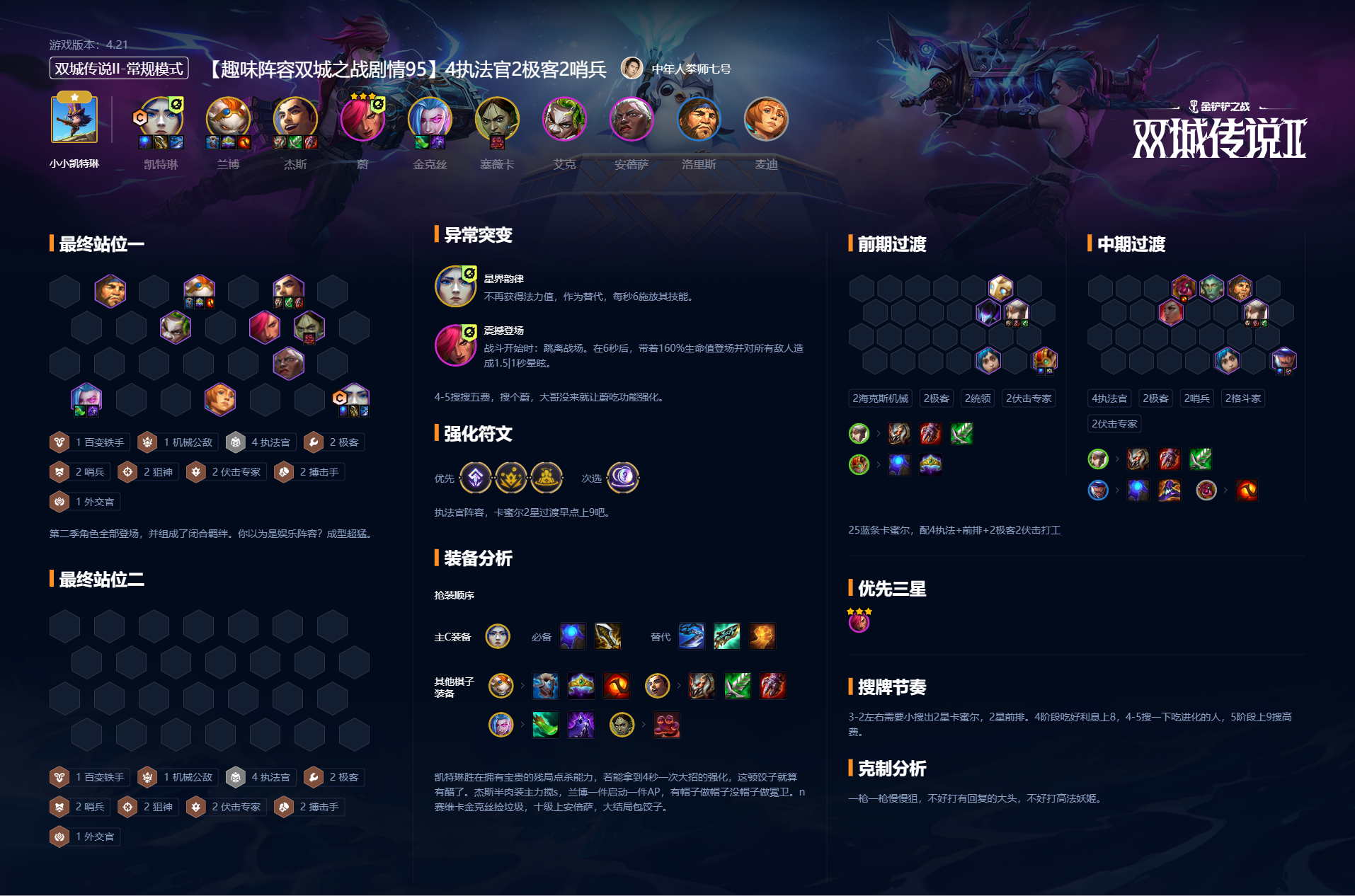 阵容分析:6极客是一套上限非常高的阵容,8人口成型后散件会变成契合棋子的成装,直接就能打出装备压制。极客羁绊能够为全队提供额外的金币和装备,使得阵容在装备上占据优势。金克丝作为主C拥有强大的AOE输出能力,配合极客羁绊的装备加成,能够在团战中造成毁灭性的打击。