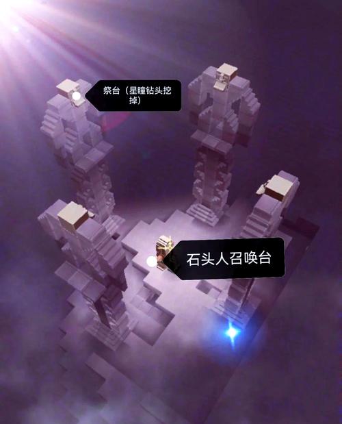 找到遗迹后,你需要在柱子的前两格位置,距离遗迹笑脸图腾三格远的地方摆放这些宝石。摆放的顺序不重要,只要每种宝石各一个,然后按照图示摆放好,就万事俱备啦!