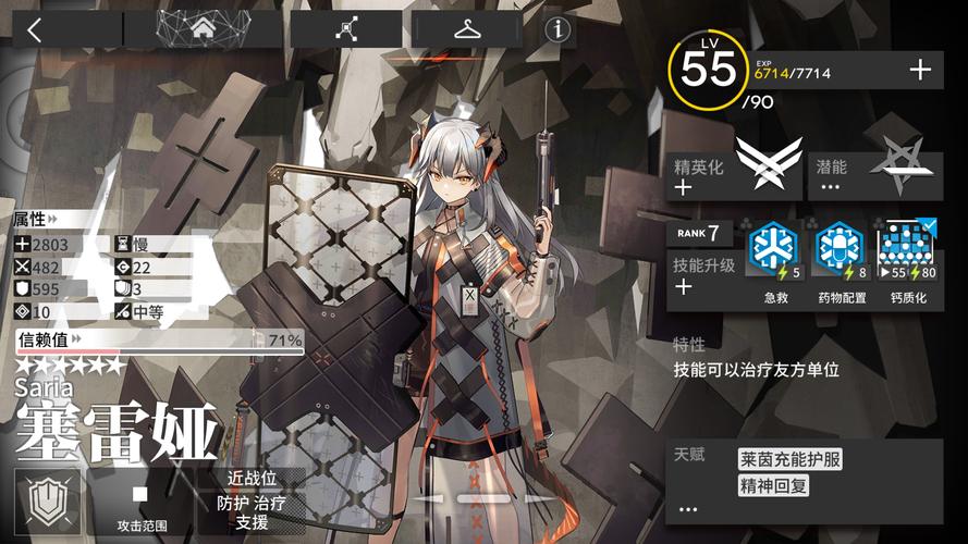 塞雷娅的一技能“急救”可以说是她的招牌技能了。这个技能可以回复周围一名血量不足一半的干员的生命,简直就是战场上的“奶妈”。而且,这个技能的回复量和塞雷娅的攻击力成正比,也就是说,塞雷娅的攻击力越高,回复量就越大。所以,如果你想要一个高坦度的奶盾,急救绝对是你的不二之选。