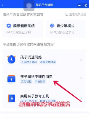 3、进去之后在网络管控家长必知会界面点击孩子网络不理性消费选项,然后选择孩子不理性消费的情况;