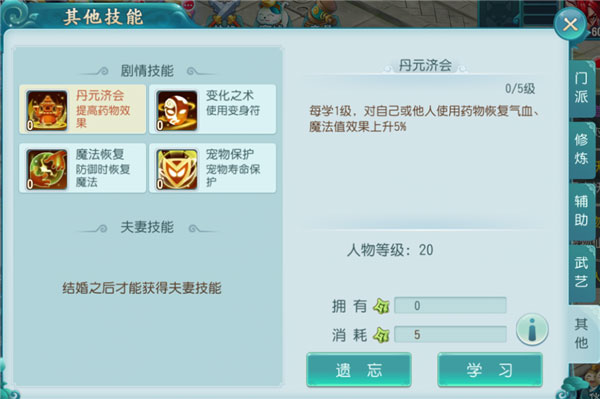 丹元济会 每学1级,对自己或他人使用药物恢复气血、魔法值效果上升5%