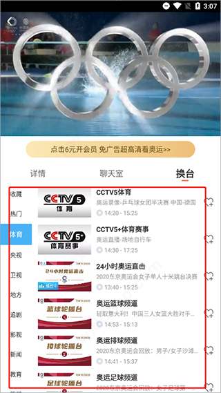 7、另外,在咪咕视频体育频道直播中还支持换台,并可随意收藏任意节目频道,或是点击对其切台