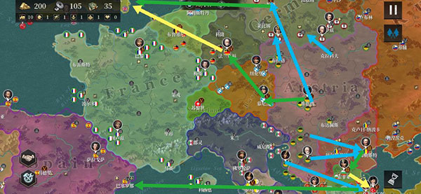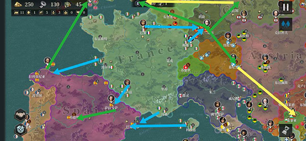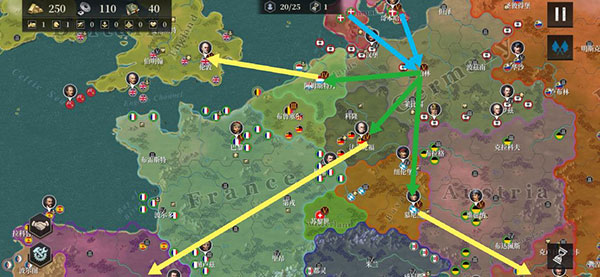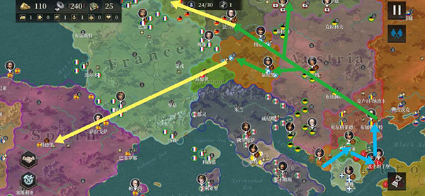 1、解决西班牙和中部,吃掉中部后派小股力量即可消灭普鲁士。
