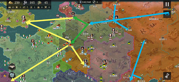 2、再拿下君士坦丁堡后宣战罗马尼亚,平定巴尔干主力往中部打过去并分一部分去打普鲁士最后登陆英格兰。