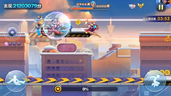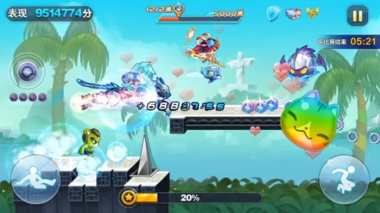 精灵中战争熊器的得分最稳定,是9000米左右爆分的关键。旋转舞娘发动技能后巨化旋转冲锋,并获得磁铁效果。这组搭配,技能在奖励关外障碍多的路段使用即可。旋转舞娘+觉醒赤兔+天照+小丑熊,宝物同上。这套搭配成本较低,万米内爆分,技能也是在奖励关外障碍多的路段使用。若将精灵替换成战争熊器,则能提前1000米左右爆分。注意各短爆搭配都要通过第一次巅峰挑战,且遇到穿越关直接出来。