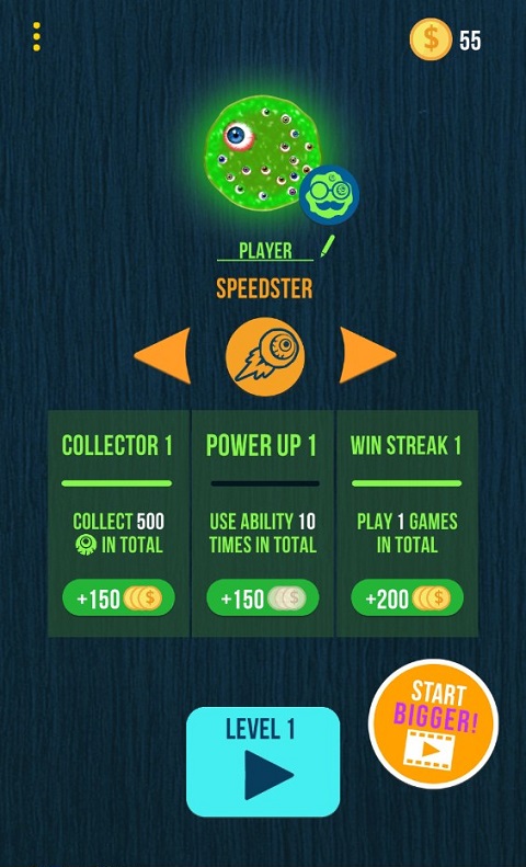 外星软泥io的好评不仅限于玩法的魔性,更得益于独特画风的设计,类似史莱姆一样的软体,非常灵动。其中“外星”则表现在软泥的外观设计上,以眼球为独特造型,随着成长,眼球会越来越多,胆小的朋友可要慎重选择哦!此外,游戏内提供了多种皮肤,每场比赛结束后你都可以通过金币进行解锁,亦或者通过升级,提高生存几率。