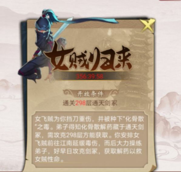 关于这个少年侠客玩法开启的方式,这边小编遇到了不少玩家的咨询,这边我就在这统一给大伙说下这个开启的流程吧。首先,需要先完成事件【女贼之难】点亮玩法图标,具体详情可看下下方图示。