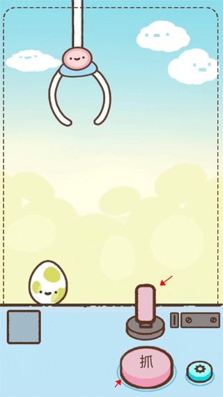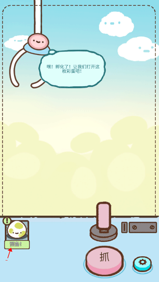 1、打开游戏之后,会有一个简单的抓彩蛋操作,让快速熟悉这个过程,首先就是按住上方的杆子移动最上方的爪子,当移动到适合的位置时,点击下面贴有“抓”这个文字的按钮。