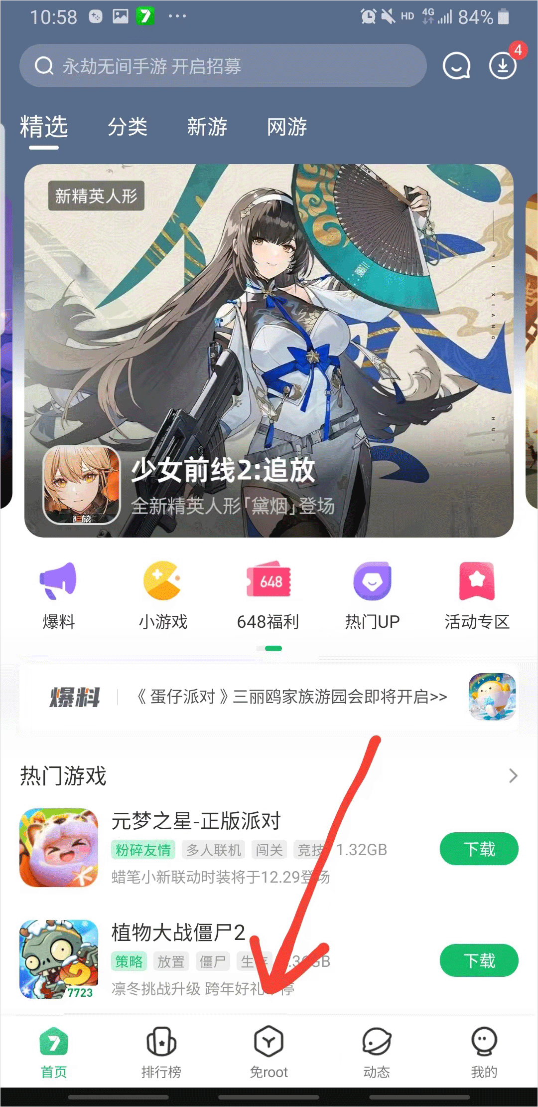 1、首先打开7723游戏盒首页点击下方中间的免root界面