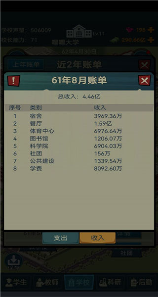 1、首先收入来源前期靠广告,中期靠餐厅和学费(餐厅平均2亿,学费平均1亿)