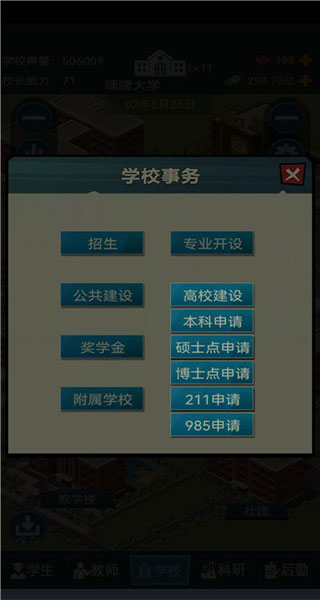 4、接下来说的是事务功能里的。事务里的招生全部拉最低,赚钱最重要。专业开设直接买完,钱够用。学校活动必须刚进游戏就点,不然你玩到后面之后才发现有这个功能的话你升级学校可以说是跟乌龟一样了该说不说。奖学金等你玩几年后再使,咱得存钱,公共建设也是开局就开始搞,摆渡车不要投放,这个开局很亏钱,直接扩建然后一直建造新的公共建设然后一直升级就行,一直升,一直建一直升,这个可以说是前期保命的了。时不时的就去看一下升级学校和高校建设需要的条件(升级学校的条件直接点开最顶上的白色学校图案),紧跟时事别忙着赚钱还待在低等级。