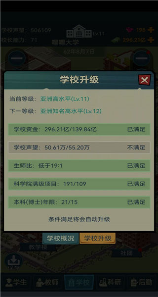 学校等级靠的是资金和声望,资金也是开六倍速怼就好,声望就特别难
