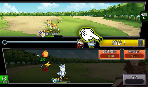 5、继续根据主线,来到森林,碰到静电幼猫的话,点击捕获开启捕获,如果玩家不知道自己搭档怪兽的技能的话,可以点击右下角的技能详情,了解它的基本技能;