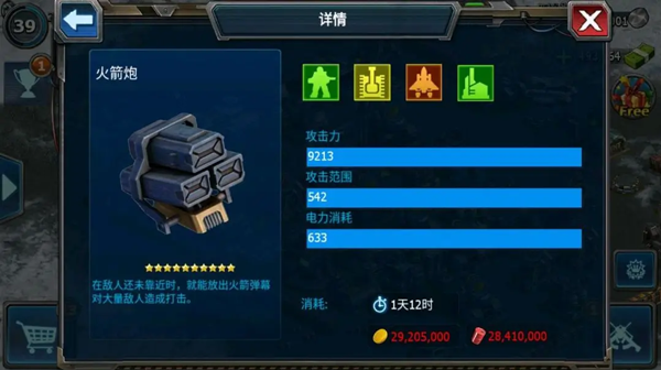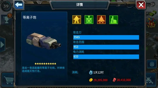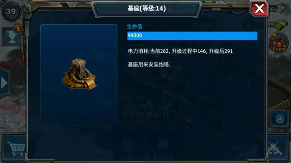 基地重要的防御设施,可在基座上安装不同类型的炮头,起到不同的防御效果;升级可提高基座自身的血量;