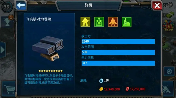 飞毛腿对地导弹可以攻击单个地面目标,并对目标周围一定范围造成溅射伤害。升级可增加射程,伤害范围及威力。升级消耗金属和石油。