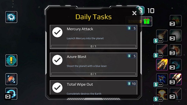 1、单击右侧的图标以选择类别和武器,点击星球以使用它。