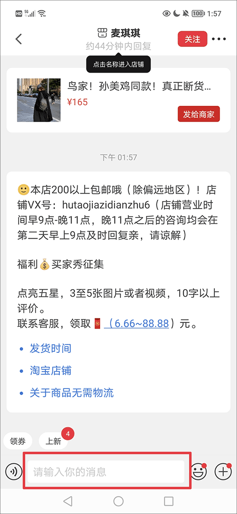 3、进入“店家客服对话”界面,点击下方“输入框”输入你想表达的意思;