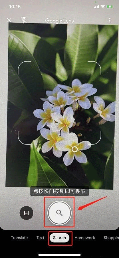 1、看到不认识的花可以用搜索识图来进行搜索,首先在下排功能内选中「搜索Search」点击「拍照」