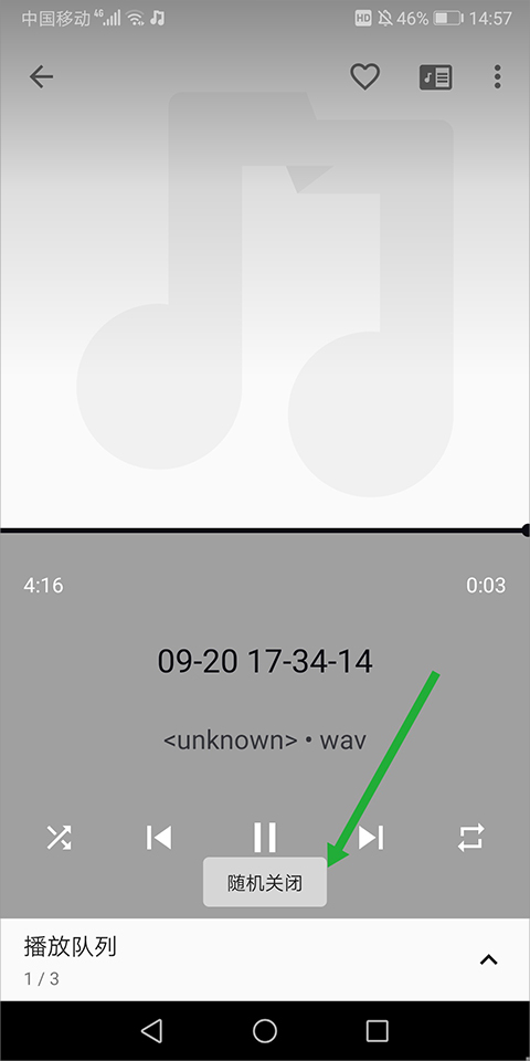 3、此时用户可以看到【随机关闭】字样(下图绿色箭头所指)就代表随机播放关闭,可以顺序播放