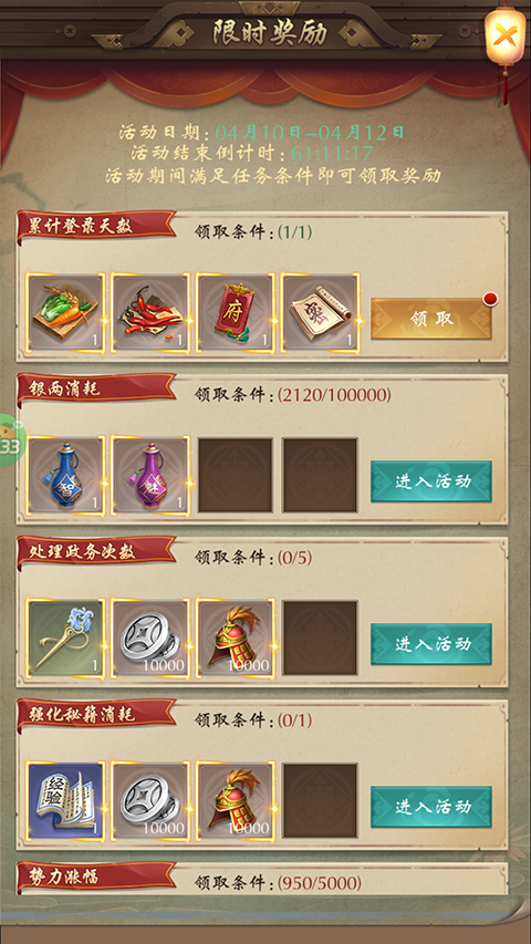 4、限时奖励,达成指定目标即可领取大量奖励。