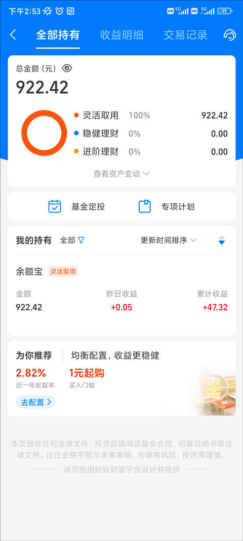 蚂蚁财富拥有财经资讯、市场行情、社区交流、智能理财顾问等服务,用户可随时随地了解金融行情,操作也特别简单,能够使用一个账号,在蚂蚁财富平台上实现余额宝、招财宝、存金宝、基金等各类理财产品的交易,让理财实现“小确幸”。