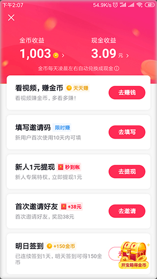 2、打开抖音极速版手机客户端后,您可通过邀请好友、完成观看视频任务等任务,获得平台向您提供的相应现金红包或金币奖励,所获金币将于次日凌晨自动换算成现金红包,计入您的个人账号中。