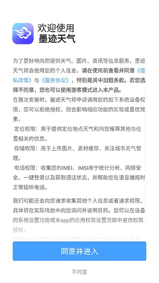 1、下载安装好本站提供的墨迹天气预报官方版软件,进入后先同意相关的协议;