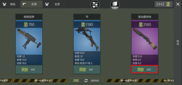 2、每当你通过一个关卡的时候都会获得奖励,这个时候就可以在商店中购买武器;