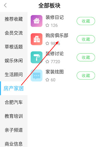 2、在板块界面选中“房产家居”,然后选择“购房俱乐部”。
