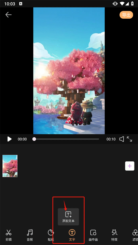 3、导入视频后在视频开头点击文字功能里面的添加文本