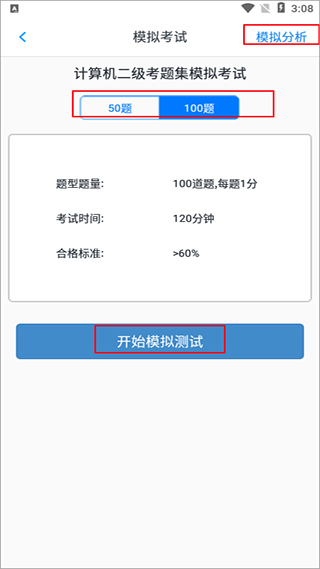 4、在主页进入模拟考试页面,选择题量后即可开始做题,也可以查看模拟分析;