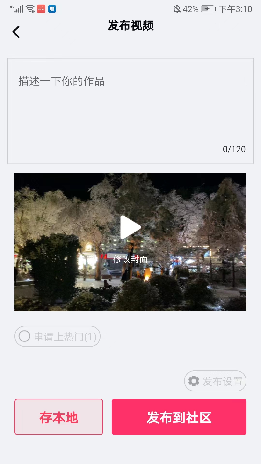 6、接着进入到发布视频界面,描述作品内容后,我们选择右下角的【发布到社区】选项,