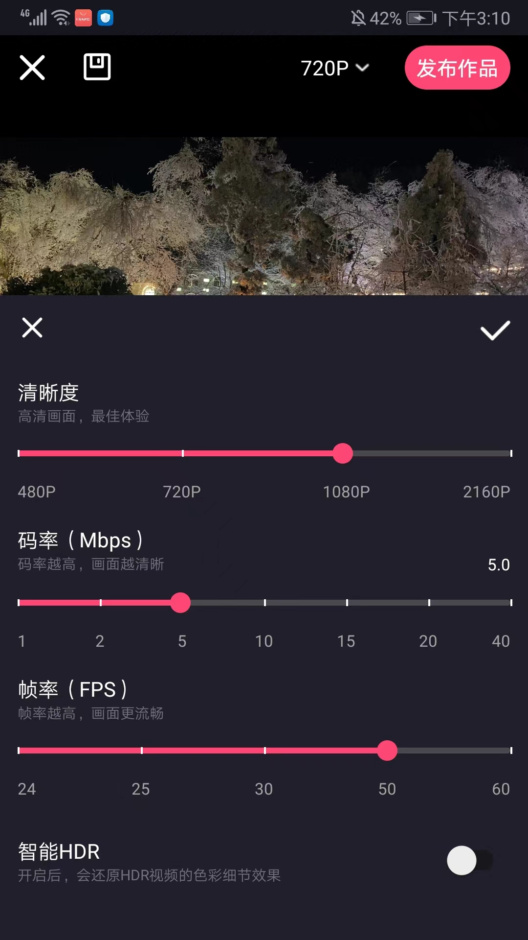 5、编辑完成后,我们点击右上角的清晰度标识,这里以【720P】为例,在当前界面可以选择更高的视频清晰度和帧率,