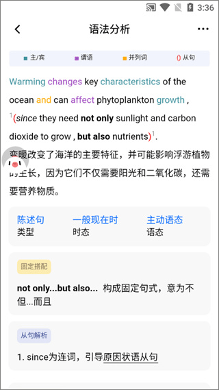 语法分析——这部分的内容涵盖了句子翻译、时态语态判断、从句与语法结构解析、相关词汇,尤其是语法结构解析格外详细。句子中的主语、谓语和并列词还会用不同颜色的字体标记,一目了然。
