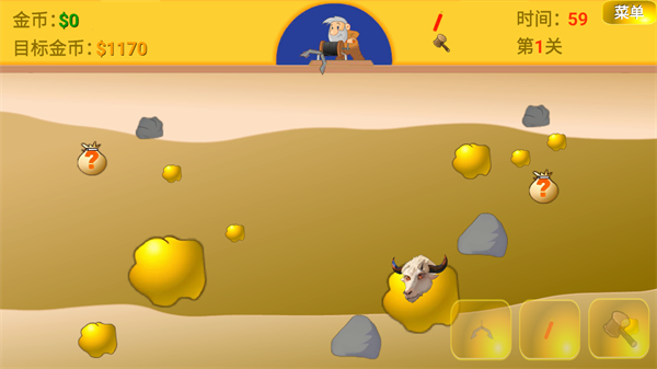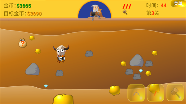 5、用锤子砸晕牛头,在用钩子抓它可以回收金币哦~