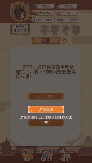 余下的时间便是作为皇帝的自由时间,期间你可以选择逛一逛皇宫,逛皇宫可以快速提升你与皇宫中人的好感度。或者你也可以选择游玩京城,这可以让你见识到各种人或事。
