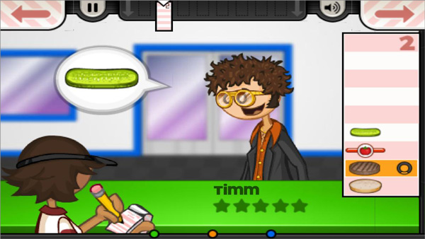 4、然后将小票拖到订单夹上,并将汉堡交给顾客,顾客评分给予相应金币。