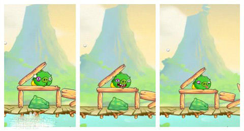 当它飞出来后要降落之前点击屏幕,这里记住点击的时候不要移动手指,小鸟就会随着原始的轨迹飞翔。速度会快很多,然后等飞到要降落的时候,松开手指就可以看见它开始旋转,速度非常的快,跟陀螺一样的进入绿猪的堡垒里面,让绿猪无处可躲。