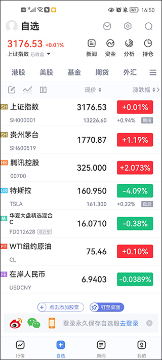 2、为您提供了特色产品自选股,包括沪深自选、港股自选、基金自选和美股自选,方便您对自己的股票及基金进行快速查看和管理。