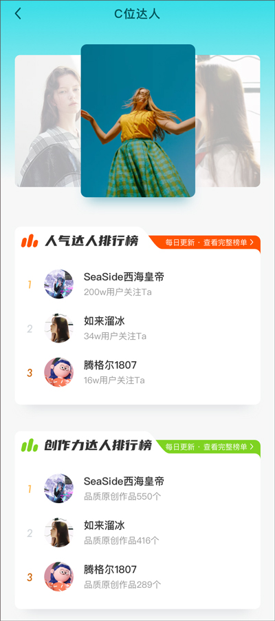 C位达人:最优秀的大学生个人展示;各个领域最顶尖、最具人气的校园达人,看他们的故事和成长,可以得到灵感、受之启发,也蜕变为更好的自己吖