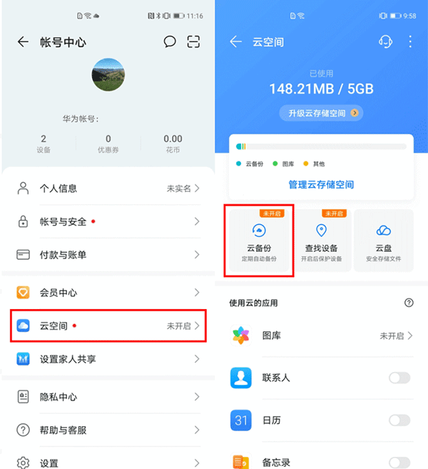 开启方法:打开【华为帐号】-【云空间】-【云备份】-开启云备份