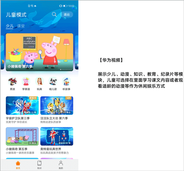 华为终端云服务为儿童打造应用生态:华为阅读、音乐、主题、视频等均设置年龄分区,全球海量曲库、海量图书以及精选的优质儿童视频内容,将为不同年龄阶段的儿童自动展示不同的内容,节省家长精心挑选的时间,让小孩自己也能学得开心,玩得开心。比如,一个10岁的小孩,家长为其注册儿童帐号,小孩使用设备时,打开视频将展示以下内容。