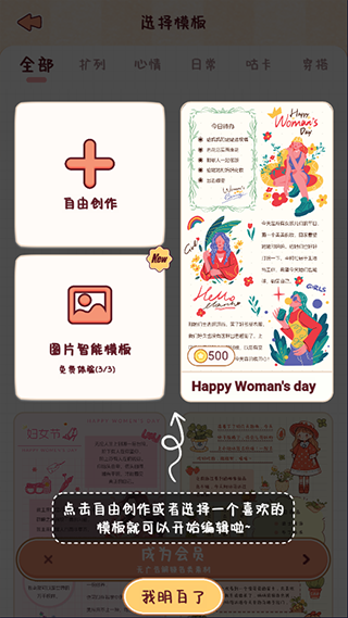 2、点击自由创作或选择一个模板即可开始编辑了