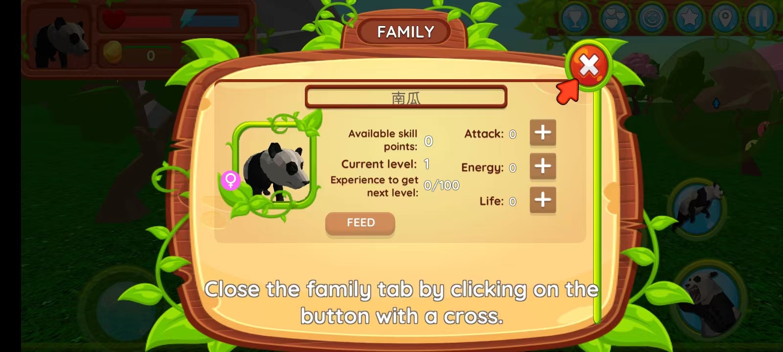 4、点击上方右边第二个按钮可以查看家庭成员的信息,现在这里只有你的熊猫信息,而其他熊猫很快就会出现,在这里,玩家可以改善熊猫的特征并制作孩子;