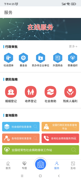 1、下载安装好国家民政部官方app,运行软件,可以看到有首页、专题、服务、互动等栏目;