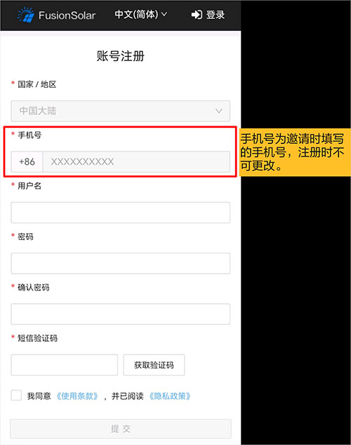 帐号注册成功后,即可使用注册的用户名和密码登录华为智能光伏App。