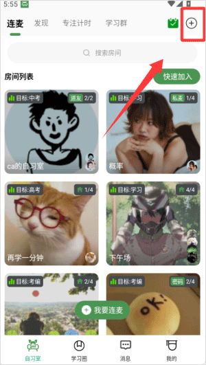 1、打开软件后先选择自习模式,可以选单人专注房或多人连麦房,建议新手从多人房开始,能听到其他同学的学习动静。
