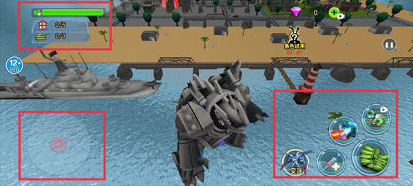 4、左边是移动方向键,右边是攻击属性,控制角色去破坏对应的目标。