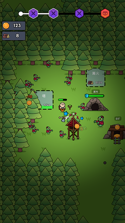 从卑微的开始,将你的基地发展成为坚固的据点。建造弓箭手塔、篝火,甚至金矿等建筑!当你收集资源时,解锁强大的升级以增强你的力量,并为未来的挑战做好准备。