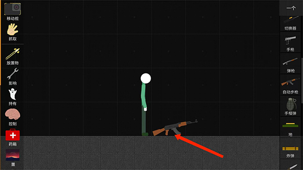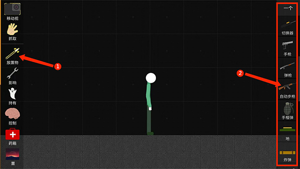 1、打开火柴人沙盒游戏,点击左边【放置物】选项,上下滑动,可看到右边会出现各种各样的东西,点击一个要拿的东西,这里以【枪】为例,
